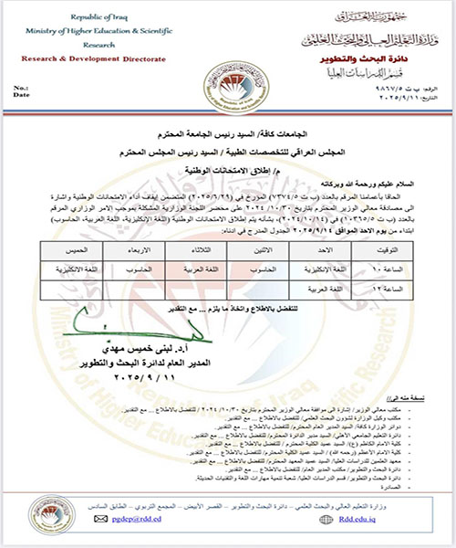إشارةً الى ماجاء في كتاب وزارة التعليم العالي والبحث والعلمي – دائرة البحث والتطوير ذي العدد ب ت 5/8418 الصادر بتأريخ 30/7/2025 وايضاً كتاب الدائرة اعلاه ذي العدد ب ت 5/8445 الصادر بتأريخ 31/7/2025، سيتم فتح اختبار الحاسوب واختبار اللغة الانكليزية في مركزنا ابتداءً من يوم الاحد الموافق 3/8/2025 ولغاية يوم الاثنين 24/8/2025 وكالتالي: